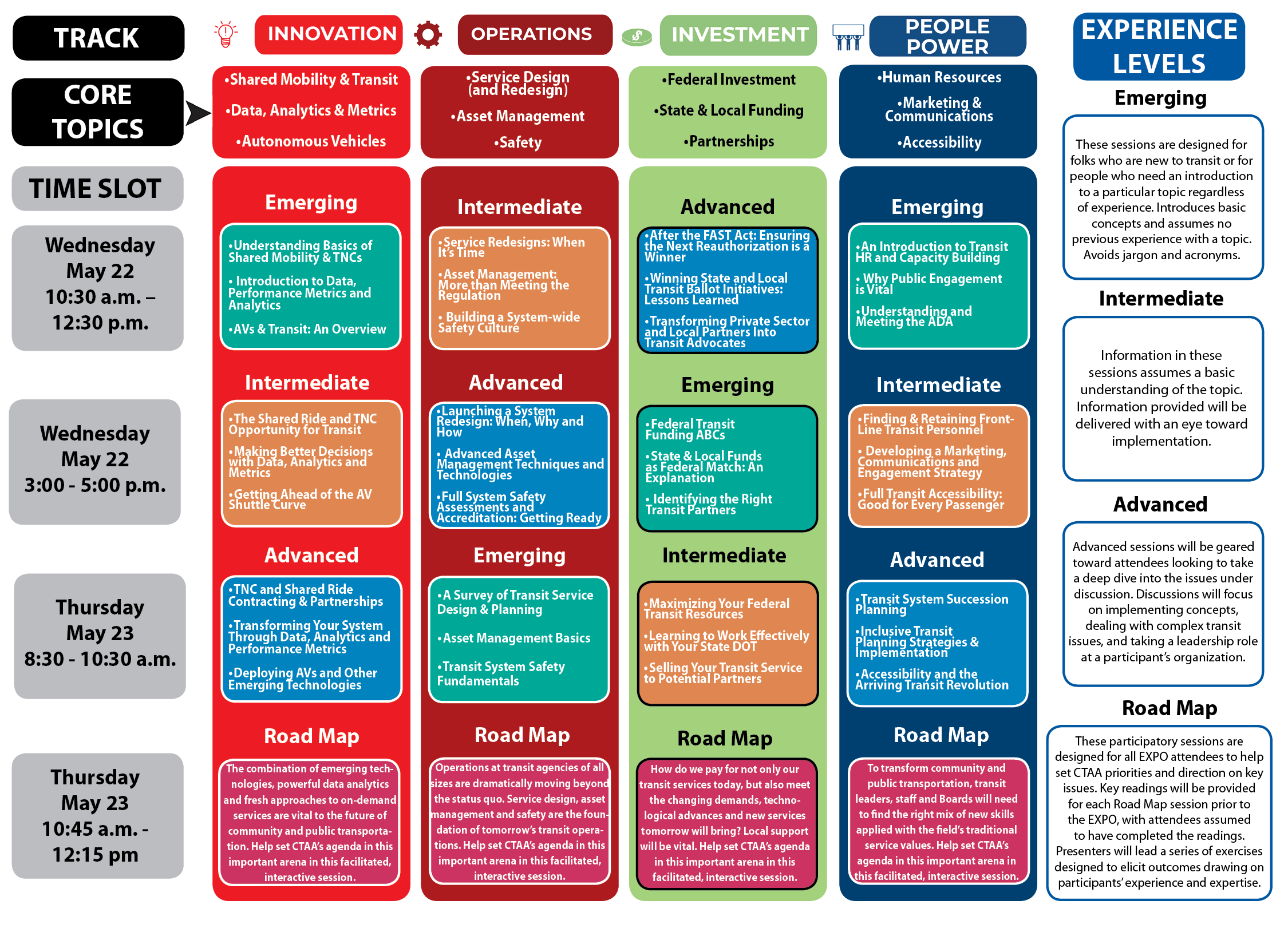 As you can plainly see, we’re not just talking about change or listing what we believe will be the most important topics for 2019. We’re delivering a fully re-designed EXPO training workshop experience for our members and conference attendees designed to ensure they leave Palm Springs with the knowledge and skills to begin improving transit and mobility in their communities immediately.